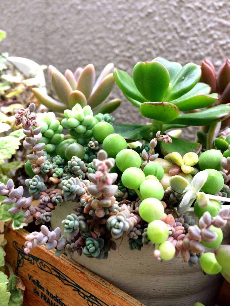 セダムの花楽しみだね〜セダムの蕾も気になるけど、グリーンネックレスのパンパンな事!綺麗だなぁ〜
