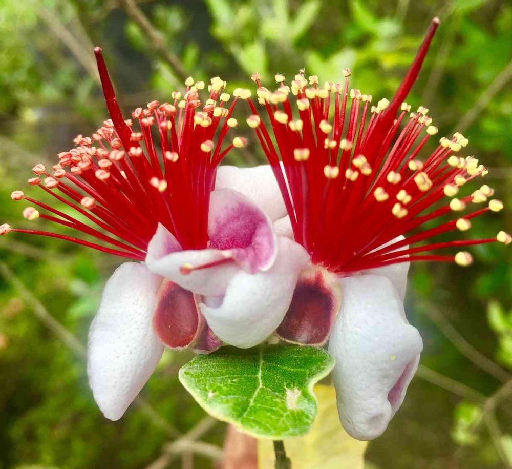 髪飾り・かんざしみたいな見た目のお花、フェイジョアも開花しました。
