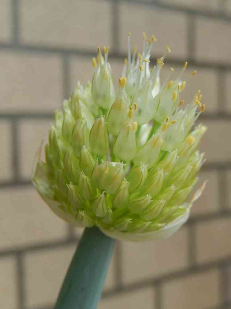 八百屋さんで買ってきた「九条ネギ」の根が,あまりにも立派だったので,5センチほど茎を残して,植えてみました.寒い頃です.青い葉は,出ては折れ,を繰り返していましたが,花茎はまっすぐに伸び,ネギ坊主になりました.