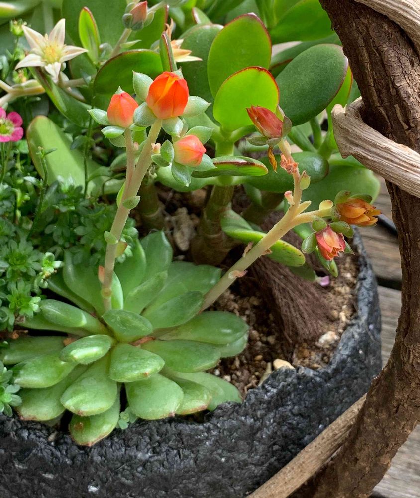 5月にオレンジの花の咲いた、手前の多肉植物の名前ご存知でしたら教えてください🙇♀️図鑑で調べても分かりませんでした💦