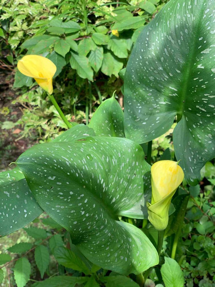 白以外のカラーは植えっぱなしだと咲きづらいかな‥と思っていましたが、この黄色のカラーは鉢植えで霜も降りる場所ですが、毎年咲いてくれます。葉も斑入りで、斑入りの葉は寒さに❄️弱いかな‥と心配してましたが、大丈夫でした✨
