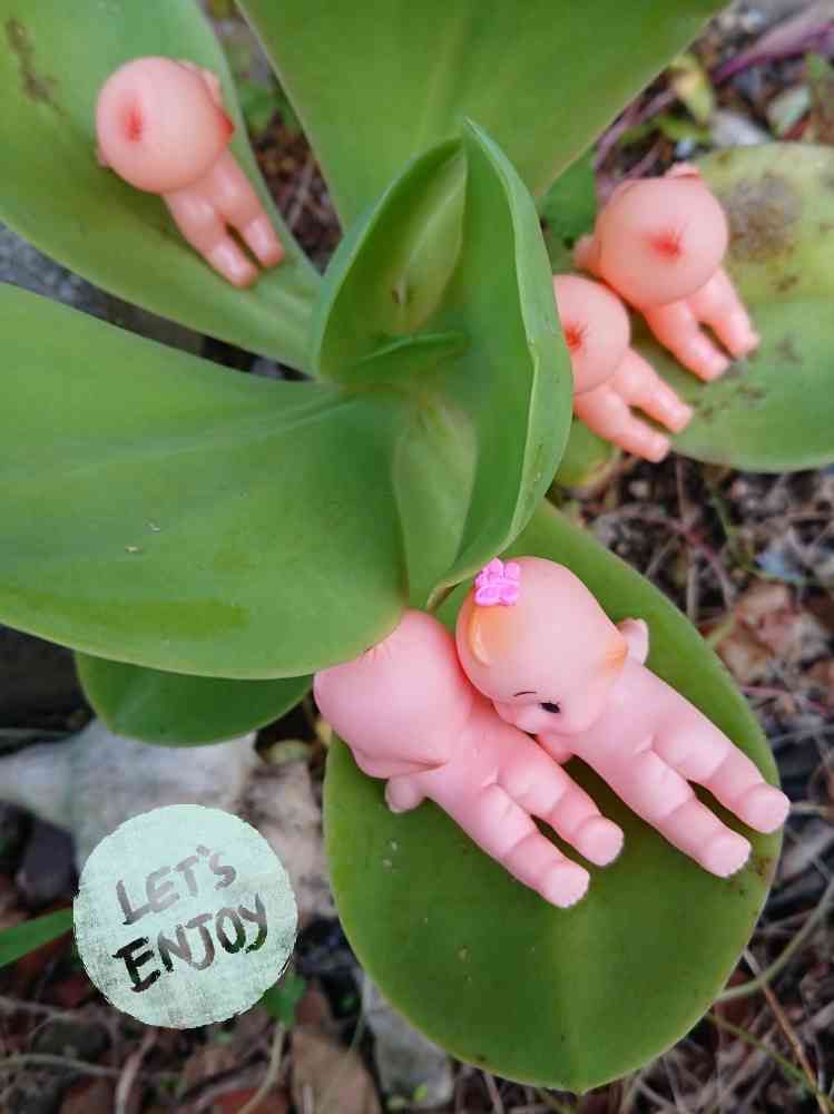 キューピーチャンやガチャガチャなどの人形と植物をコラボするのを楽しむキモカワ倶楽部デス😹