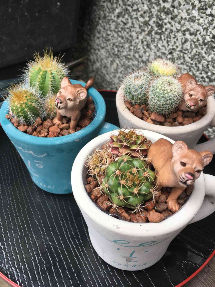 先日、¥480で売られていたサボテンがこの三鉢が売れ残り、一鉢¥100で売られてたのでお連れしました。どうも、サボテンじゃなくてこの横にいる動物が目当てだったのかも、キリンとかライオンとかもいたのですが、この同じ動物だけが残ってました