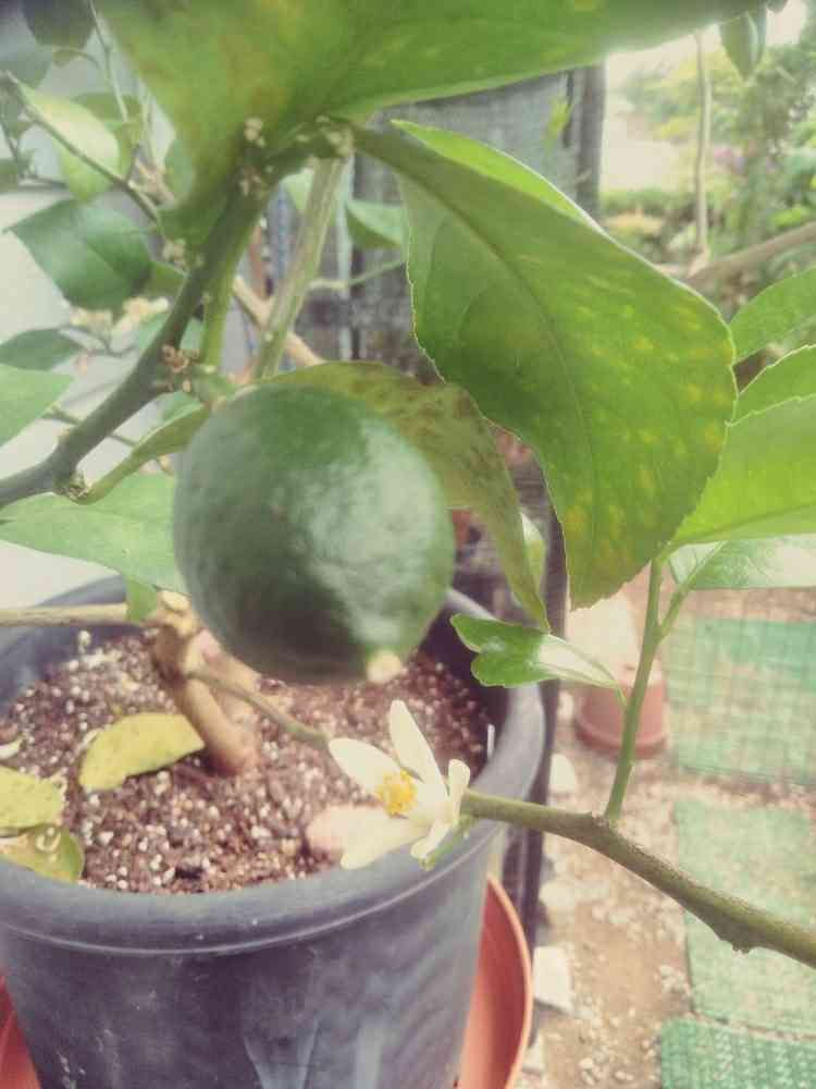 1番花のレモンの幼果です。現在2番花が咲いていますが大分レモンらしくなって来ました。