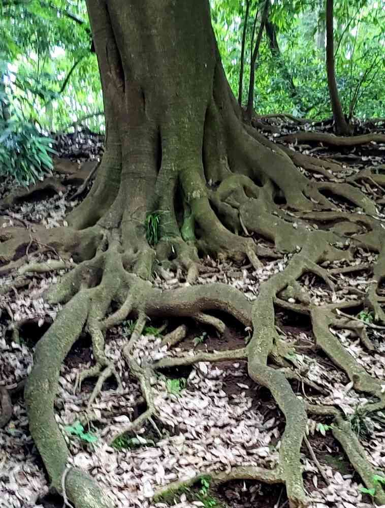 地中の養分や水分などが足りなくて根が地上に出てくる場合もあるようですが、これは斜面にはえていたので、根元の土が雨風に浸食されて地表に現れてきたのかなと思います。😃
