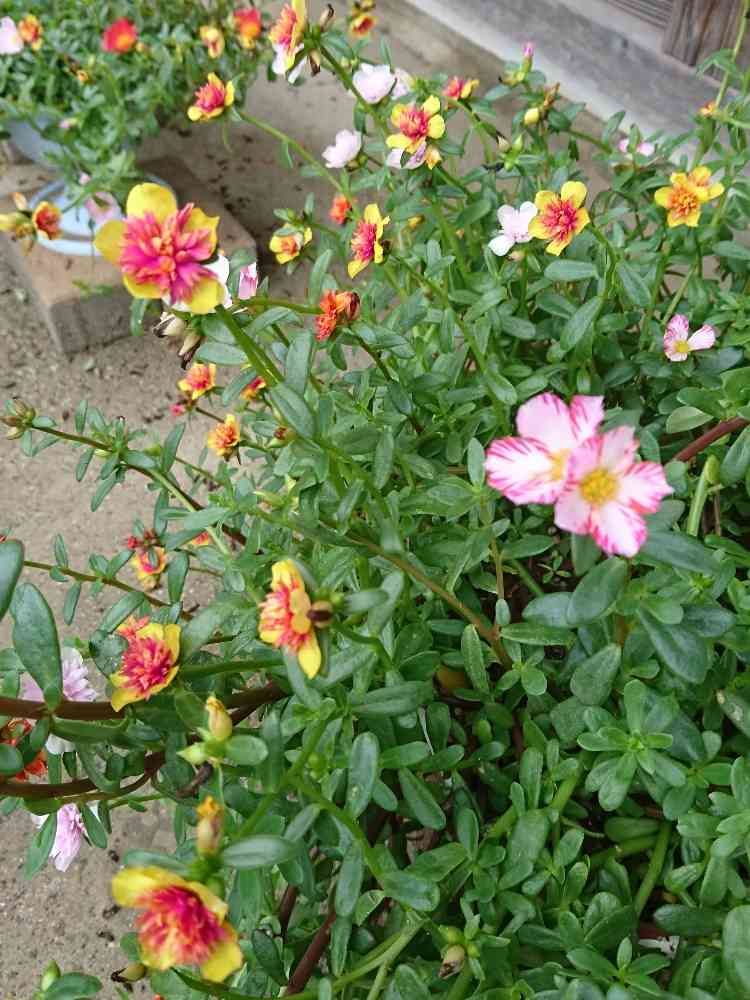 この鉢植えは 2色咲きと八重咲きの ポーチュラカさんを 5株 植えてます😊…