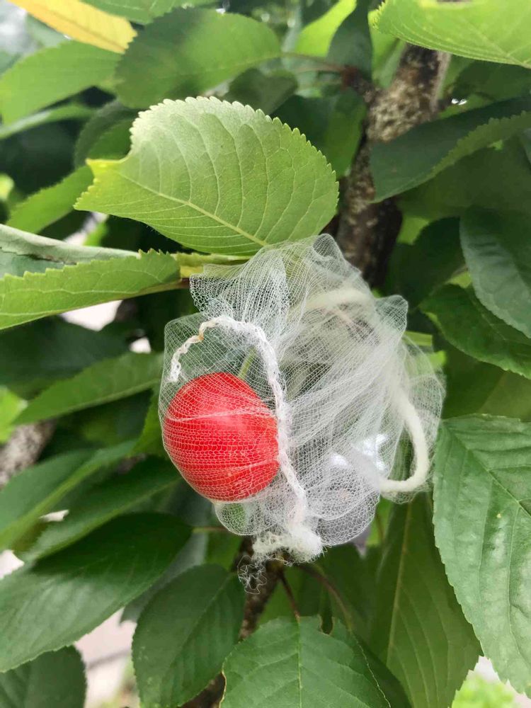 さん、はい、さくらんぼは虫がつきやすいし、赤くなってくると野鳥にくわれるので、防除のつもりでキッチンの排水口ネットかけてます。