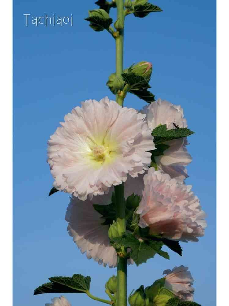 白系のタチアオイ、青空に負けそう…。抜けるような白なら、張り合えるのに…。🌼🤔
