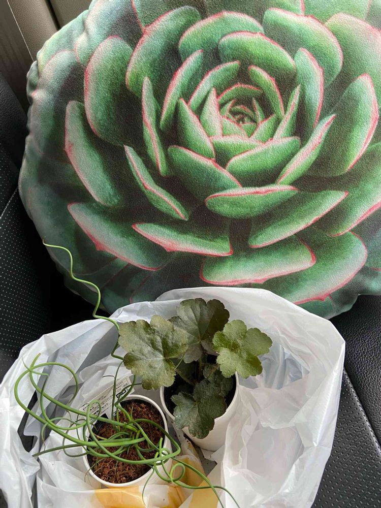 今日の収穫💚ダイソー岐南店でアルブカと、ヒューケラかな?🤫だったら嬉しいなあ😌エケベリアのクッションは、ニトリで以前一目惚れしてドライブのお供になってます💚