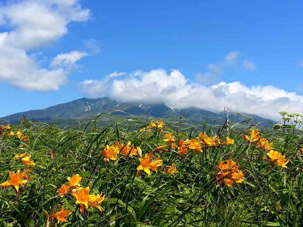 雲に頂上が隠れてるから難しいけど、ヒントは手前に群生しているエゾカンゾウ。この山は別名が○○富士って言うくらいシンボル的なお山です。