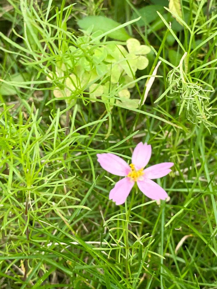 お隣さんちのコスモスの飛んで来た種から生えたちっちゃなコスモス。