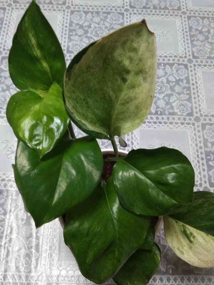 変種?普通の葉っぱは、斑が入るのですが、緑1色の変わり葉っぱが出たので、個別に植えて、緑色のステータスを楽しんでいましたが…新芽に、薄く白い斑が出てしまいました😅