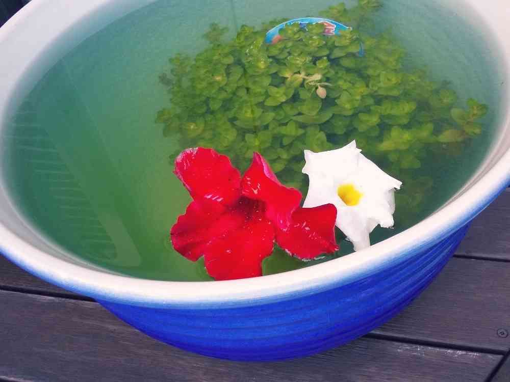 昨晩の大雨で落ちたマンデビラサンパラソル⛱️と沢山の雨水の溜まった鉢で遊んでました➰🥰15センチ近くお水が増えていました😅