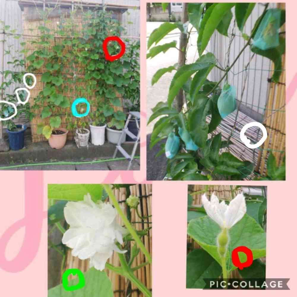 今年のグリーンカーテンの様子をご報告致します。 画面の白丸はバッションフルーツ、トケイソウです。今6個育成中です。緑色?は西洋アサガオ、ジプシーブダイダルお洒落なアサガオです。赤丸は千成ひょうたんの花、です。見えるかな?花の付け根に可愛いひょうたんの赤ちゃんが着いています。皆んな