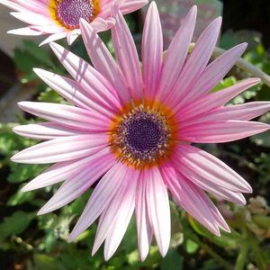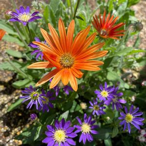 陽射しの中でお花たちがキラキラ輝く!オレンジ色のアークトチスと、紫のミヤコワスレがコラボ中♪