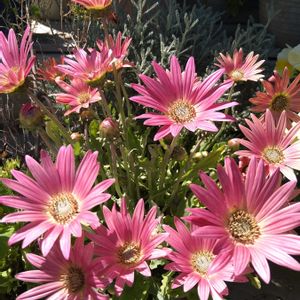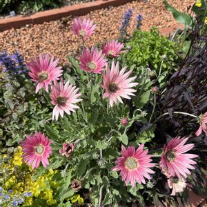 玄関脇のお花達✨🩷💗✨ ① ベニジオアークトチスフルッサンス ③ シレネのぷっくり横顔が好きです🎶 ④⑤ 3〜4年目になるローダンセマム🤗 いろいろ混ざってしまって品種名分からなくなりました🤣