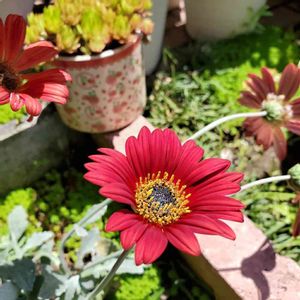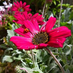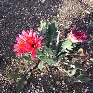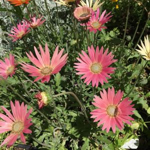 マーガレット?ガーベラ?よく分かりませんが😆💦シルバーの葉と鮮やかな色がとても素敵でした😻💖💕 先程アークトチスと教えて頂きました❣️ ウォーキング途中の花壇