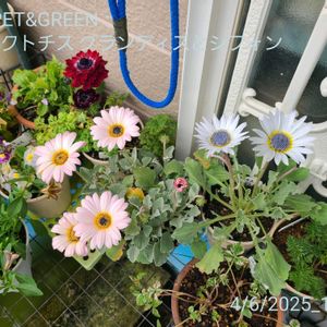 寄せ植えのアークトチスがやっと花数増えて来ました🌸 ↙️がエンジェルウイング・ワイン🌸 右上↗️のはゲブラさんのプルミエ・シフォン🌸 可愛い〜( ˘͈ ᵕ ˘͈ )💕 もう黄砂は大丈夫かな☘️ 明日は庭活頑張ろう♬ 今日東京は27℃ですって💦 夏が怖い🙀