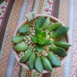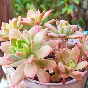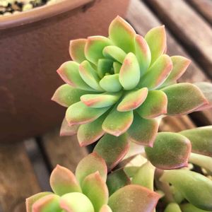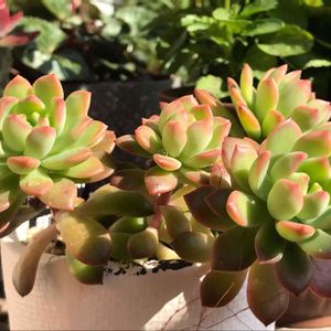 雨も上がりすっきり晴れ渡った空、そして心地よい風 木漏れ日を浴びる多肉たちも気持ちよさそう☺️ この寄せ植えはGSを始めたばかりの1月8日に投稿した物 右側だけ少し手直ししました 一回り大きくなった春萌の葉先がちょんと赤くなって可愛いです☺️