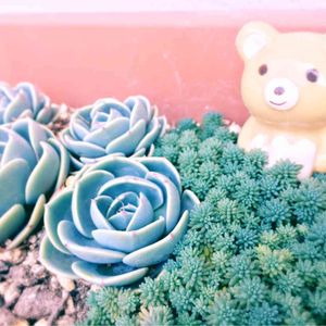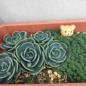 おはょーぅ(✿´ ꒳ ` )ノ 外越しの七福神とセダムパリダムが仲良くもりもりになってきたょ〜 くまちゃんがここの見張り番🐻 パリダムって地植えだと横に増えるんだけど、鉢植えだと上に伸びてひょろ長くなるのはナゼ???