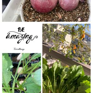 今日のお花【かぶ】水耕栽培 みやま小かぶと もものすけ 収穫しました♪ 色づいてきたトマト🍅と撮影❣️ 皮剥いて小かぶの丸かじりしました。 甘〜くて美味しい😋 コレで七草粥もどき作ります♪