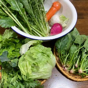 おはようございます☺️♪ 野菜モリモリたべます❣️ かぶの葉、水菜、人参、かぶ、もものすけ、ほうれん草、レタス、サンチュ、ブロッコリーの脇芽、春菊💚