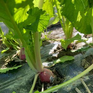 ターサイを一株収穫しました。 他はミニ大根を1本、各種大根と蕪の間引き大根葉です。