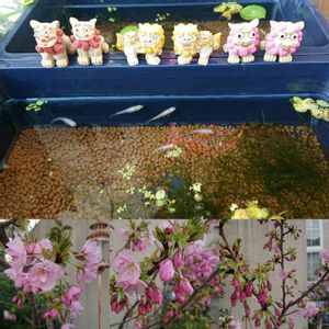 🏷️2021シーサーの日 参加しまぁす🎵 メダカとシーサー ⬇️一才桜🌸が咲いて来たよ。 蕾も可愛い💕