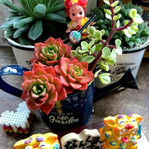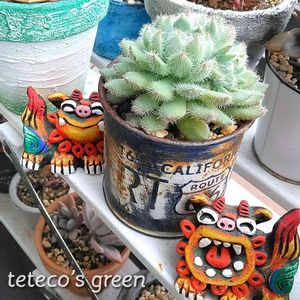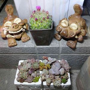 2021シーサーの日🏷参加しまーす😁 我が家のシーサー並べてみたよー😆 多肉ちゃんは大きい子を選びましたー☘️ 左・真っ黒法師 中・テトラゴナ 右・紅日傘 中央・黄色いお花が咲いてるのは三時草🌼