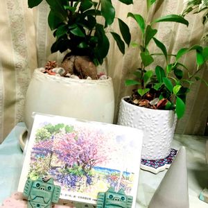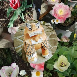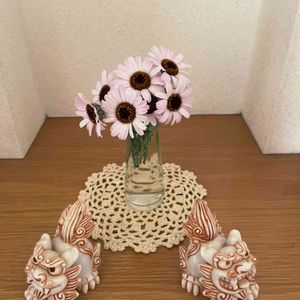 2021シーサーの日 いつも楽しませて頂く若者ユーザーさん方(皆さんこぞって挙手🙋♀️しましょう🤭⤴️)のお一人が開催されてます🎶 数年前孫っち👧がお土産にくれた小さなシーサー…こんなのしか無いしなぁ😑と思っていましたが 参加させて頂きます🤭💦 つる性ガジュマルと🌿 小さいのにお水大好き💕みたいで 直ぐにシンナリします。 分かりやすい子ですね🤭💦 最近の私の「作りたいが止まらない」と一緒に🤭💦 毛糸の花です💠 隙間時間にハマっています😑 何が主役か判らない投稿になりました😐️💦