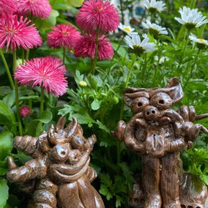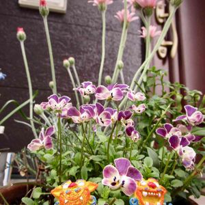 kaorioka 2 ちゃん主催の 🏷2021シーサーの日🦁に連投参加します🎶 🌿ビオラ♡コリーナテラコッタ🌿 溢れるほどにもりもり咲いてます🧡 レンガ色のアンティーク風の色合いが綺麗です✨ シーサーは息子の子供の頃の手作りです👦