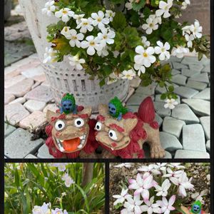 こんにちは🎶 りなははさん主催 🏷️「毎月3日は耳の日」 kaorioka2さん主催 🏷️2021年シーサーの日 参加させて頂きます。 右:ミツバツツジの蕾と小さくなった帽子👒は、どちらも🐰耳のようになっていました。💕 左:🌸桜の花吹雪のなか、シーサー君達と花見に出掛けました。🚴♀️♪♪♪ シーサーは、数年前に沖縄旅行✈️をした親戚のみやげ品デス。😃♪ 💛オオキバナカタバミ ♡アリウムトリケトラムは、花びらに💚緑色のラインが入っていて、小粒なのにとてもオシャレなのです。😉 ☆江戸川区一之江・境川親水緑道 ☆2021年4月1日撮影 皆様 良い休日をお過ごしください。🍀 🍀