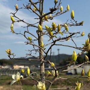 黄色いインコ🦜🦜🦜が沢山 枝に止まっている ように見えるこちらは モクレンです🤗 年々花付きが良くなってきています🥰