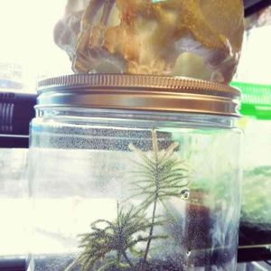 コウヤノマンネングサのボトルコケリウム。100均の入れ物の選択を誤った、すぐ天井につかえてしまう😅
