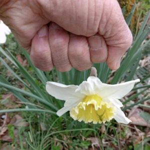 大輪水仙 家庭菜園脇の水仙、花経が大人の拳大の大きな花を咲かせています。 芯の花弁は、淡いクリーム色です。