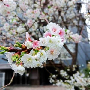 源平桜 散歩道(京都丹波亀岡 市庁舎近傍)で、赤白二色の桜が開花していました。 ネット検索🔎した所、源平桜と判明しました。 桜の二色咲は、珍しい様です。