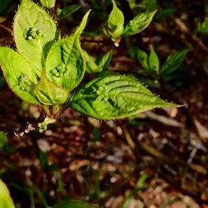 ハナイカダ ハナイカダには、二つのものが、、、 ①桜の花弁が川面に浮かび流れる姿 ②植物の葉の表面に咲く花(写真) の二つです。 葉の表面に咲く花は、まだ見た事がありません。 これは、蕾の姿です。