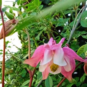 小さな庭のオダマキ オダマキの開花です。 ピンク色の鮮やかな花姿を見せてくれます。
