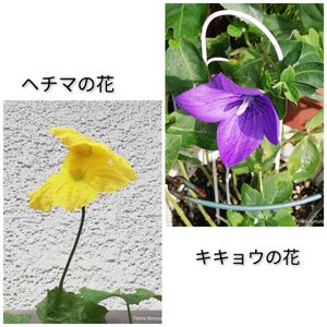 小さな庭の今日の花 小さな庭に「ヘチマ」と「キキョウ」の花です。