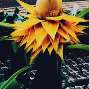 園芸店の店頭の花 散歩道(京都丹波亀岡)の店頭で見かけた巨大な花(蓮?)が、、、 「雲南地湧金蓮(うんなんちゆうきんれん)」との名前が付けてあった。 高さ約1mの初めて見る黄色い花でした。