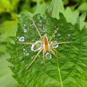 キンイロエビグモ 家庭菜園(京都丹波亀岡)で見つけた「キンイロエビグモ」です。 雨上がりの大葉の上に、、、