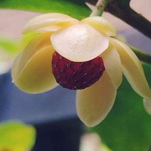美男葛(サネカズラ) わが家の小さな庭の「サネカズラ」の花が咲きだしました。 花弁は分厚い蝋細工の様で、花芯に赤い球が、、、 これが、ゴルフボールの様な実の集合体になります。
