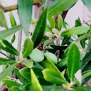 散歩道のオリーブ 散歩道のオリーブの木に、小さい実を見つけました。 オリーブの実の幼生でした。 秋には、黒く熟します。