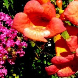 暑さの饗宴 小さな庭のノウゼンカズラとサルスベリが饗宴(競演?)していました。 京都市内の気温が38℃を超えています。 暑いですね🥵。