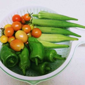 今朝の収穫(一部) 家庭菜園(京都丹波亀岡)での今朝の収穫の一部です。 雨の合間を縫って収穫しました。 オクラ(2種)、ミニトマト(3種) 、ピーマン、万願寺唐辛子、獅子唐、キューリ、などでした。