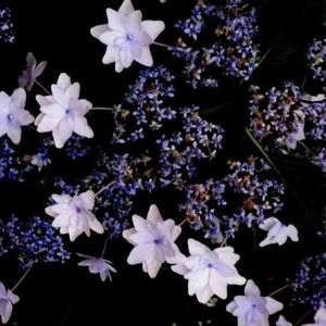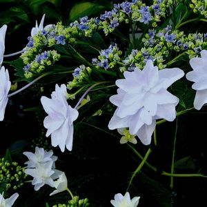 墨田の花火 小さな庭の額紫陽花「墨田の花火(紫陽花の名称)」が色付いて来ました。 額が白から薄青に、花心部は青色に、、、