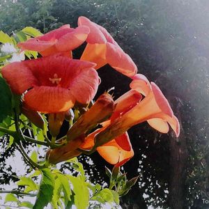 真夏日のノウゼンカズラ 散歩道のノウゼンカズラが開花しました。 6月の真夏日に呼応した開花です。