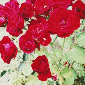 散歩道に咲いていました。 1本の軸に沢山の深紅の花をつけていました。 バラですが、名前が判りません。