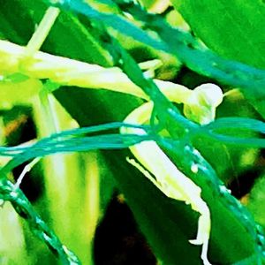カマキリの赤ちゃん 家庭菜園のネット裏にカマキリの赤ちゃんが、、、 体色の同化の練習中です。