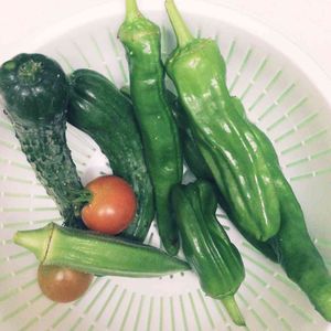 初収穫 家庭菜園の今年の夏野菜です。 最初にできる実は、苗の負担を軽減する為、早めに収穫します。 キューリ、甘長トウ、ピーマン、オクラ、ミニトマトです。